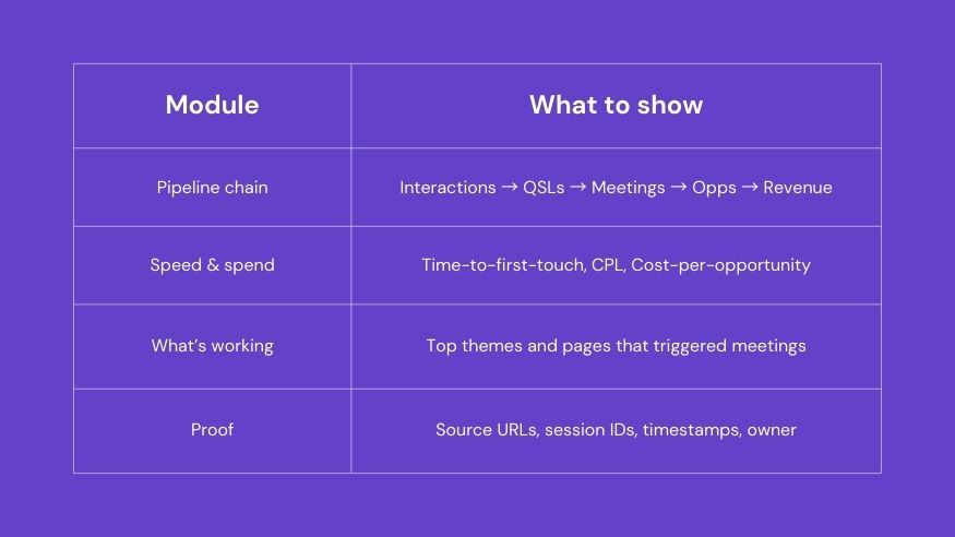 Show the full path: Interaction → QSL → Meeting → Opportunity → Revenue. Cut by session theme, sponsor tier, and named account lists. Include owner, time-to-first-touch, and source URL for each meeting/opportunity line.